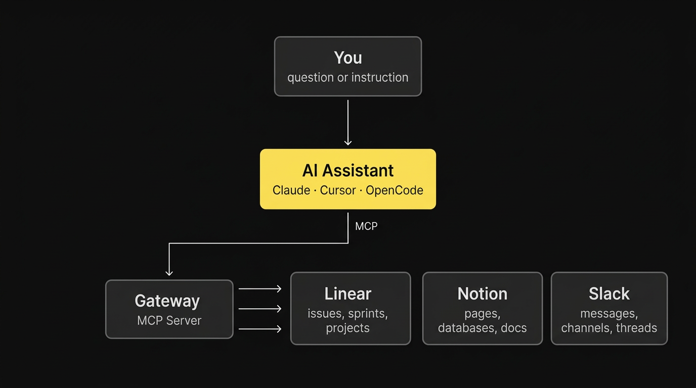 When you say "Find my Linear issues about the auth bug", your AI: